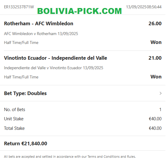 13.09.2025 | AFC Wimbledon vs Rotherham | 2/1 | 26.00 | 0 – 1 | 2 – 1 |