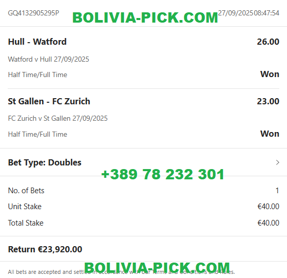 27.09.2025 | Watford vs Hull | 2/1 | 26.00 | 0 – 1 | 2 – 1 |