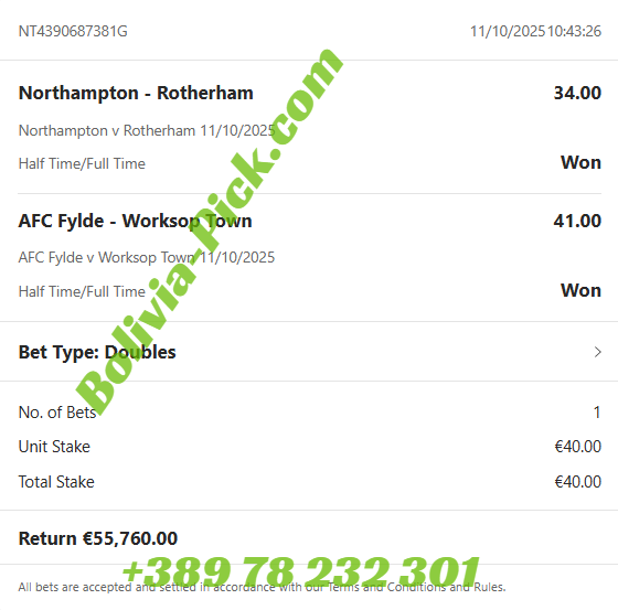 11.10.2025 | AFC Fylde vs Worksop | 1/2 | 41.00 | 1 – 0 | 2 – 3 |